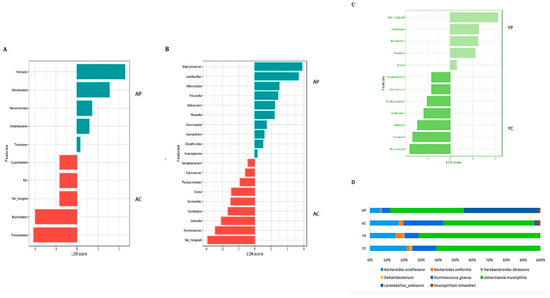 Comparative analysis with Linear Discriminant Analysis (LDA) Effect Size (LEfSe) scoring plot using Kruskal-Wallis rank sum test (p = 0.01 and log LDA threshold cut-off value = 1.0). Aging groups at Phylum (A) and genus (B) level. Young groups at genus (C) level. Significant changes at species (D) level. (YC) Young control group, (YP) young probiotic group, (AC) aging control group, (AP) aging probiotic group.