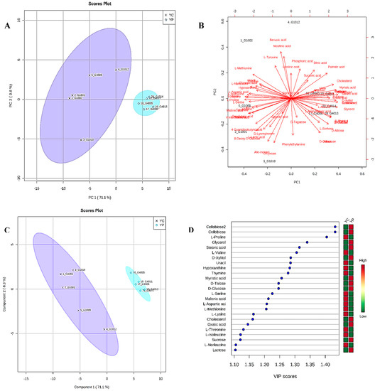 (A) Principal component analysis (PCA) plot of feces collected from young control (YC, violet color) and young treatment groups (YP, blue color) showing divergence. (B) Bi-plot showing compounds responsible for divergence. (C) 2D-PLS-DA plot showing spatial division among groups. (D) Key compounds separating YC and YP based on variable importance in projection (VIP) score plot in PLS-DA analysis.
