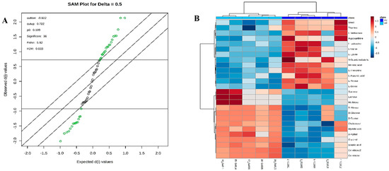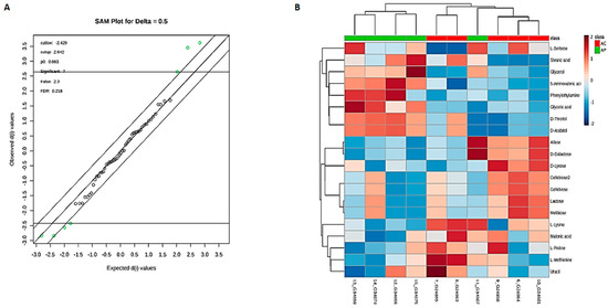 Significance analysis of microarray (SAM) plot (A) (Delta score = 0.5, metabolites highlighted in green are significant). Significant changes in metabolites are expressed as a heat map (B) in aging groups. (AC) Aging control group, (AP) Aging probiotic group.
