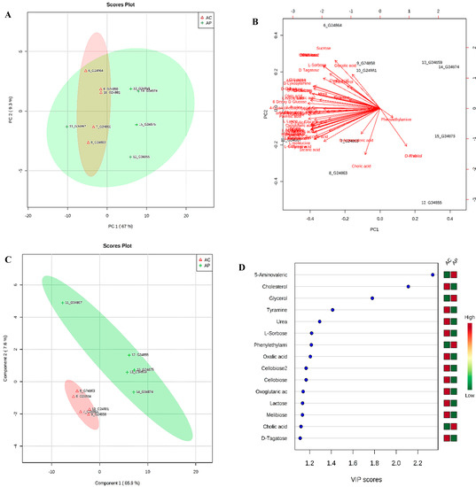 (A) PCA plot of feces collected from aging control (AC, red color) and aging probiotic groups (AP, green color) showing divergence. (B) Bi-plot showing compounds responsible for divergence (C) 2D-PLS-DA plot showing spatial division among groups (D) Key compounds separating AC and AP based on variable importance in projection (VIP) score plot in PLS-DA analysis.