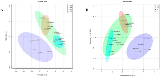 PCA plot (A) and PLS-DA plot (B) showing spatial division among all four groups. (YC) young control group, (YP) young probiotic group, (AC) aging control group, (AP) aging probiotic group.