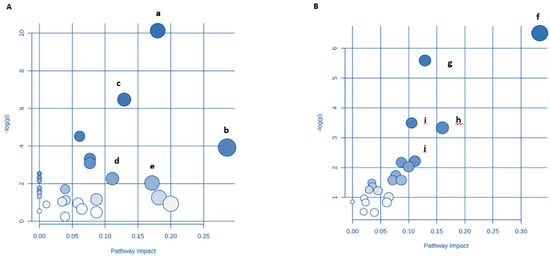 Potential pathways for the young probiotic group (YP) and aging probiotic group (AP), after DDS-1 supplementation, in fecal extracts identified using MetPA pathway analysis. YP group (A) with pathways (a) Valine, leucine, and isoleucine biosynthesis (b) Aminoacyl-tRNA biosynthesis (c) Glycine, serine, and threonine metabolism (d) Galactose metabolism (e) Cysteine and methionine metabolism. AP group (B) with pathways (f) D-Glutamine and D-glutamate metabolism (g) Alanine, aspartate, and glutamate metabolism (h) Galactose metabolism (i) Nitrogen metabolism (j) Butanoate metabolism.