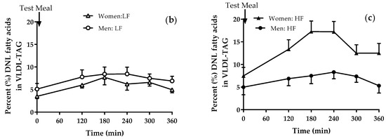 - Timlin, M.T.; Parks, E.J. Temporal pattern of de novo lipogenesis in the postprandial state in healthy men. Am. J. Clin. Nutr. 2005, 81, 35–42. [Google Scholar] [CrossRef] [PubMed]