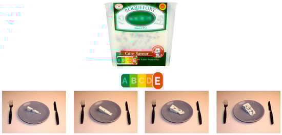 Very few studies have investigated the impact of FoP nutritional labelling on portion size selection [,,], while a review has suggested that they may modify the perception of consumers of the nutritional quality of products, and then lead to “halo” effect, influencing the quantities consumed []. Indeed, misinterpretations of the actual nutritional content of a food may lead consumers towards larger portions and overconsumption of less healthy foods []. Therefore, it appears of major importance to study the effects of FoP nutrition labels on portion size selection, and in particular for less healthy options, for which a reduction in the portion size would be of interest.
