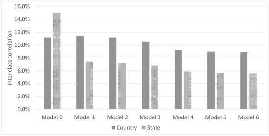In the multi-level analysis, we estimated the interclass correlation and the within country variability (community) as we introduce the different levels in the multivariate analysis. Figure 2 shows that 11% and 15% of the variability is attributable to differences between countries and states (or other subnational administrative division among countries). The interclass correlations decrease as additional groups of variables are introduced into the model. In the full model, the interclass correlation stands at 9% and 5.7% percent for the national and subnational level respectively.