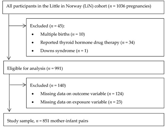 The LiN study is a population-based prospective cohort established to investigate pre- and postnatal risk factors influencing developmental plasticity from pregnancy to age 18 months. Pregnant women were enrolled at nine public health clinics for mothers and children across all four Norwegian health regions. The clinics were chosen after considering demographic characteristics and size of the population to include participants from both cities and rural districts with a wide distribution of socioeconomic conditions. From each site, one public health care nurse was trained as a research assistant. Enrolment started in September 2011 and ended October 2012. Midwives at the public health clinics approached pregnant women 16–26 weeks gestation with an invitation to participate; however, some women were asked as late as weeks 31–34. Data collection up to age 18 months ended in November 2014. Attrition analysis for the mothers in the LiN study is reported by Fredriksen et al. [26]. Inclusion criteria for analysis in the present study were available data on UIC and on child development, singleton pregnancy, no thyroid medication in pregnancy, and no severe genetic disorder (Figure 1).