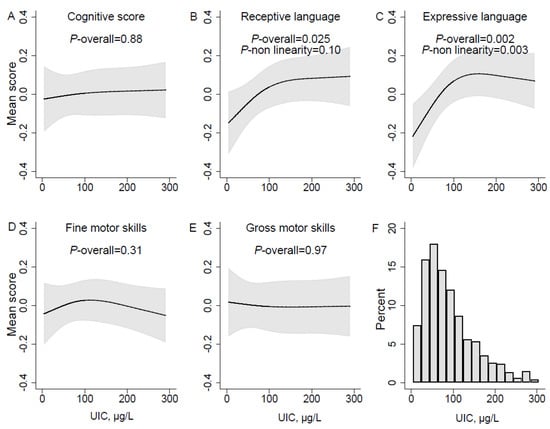 UIC µg/L in pregnancy and mean neurodevelopmental scores estimated in mixed models over sampling occasions at child age 6, 12, and 18 months. Panel A-E represent different neurodevelopmental domains, (A) Cognitive score; (B) Receptive language; (C) Expressive language; (D) Fine motor skills; (E) Gross motor skills. The histogram in panel (F) illustrates the distribution of urinary iodine concentration (µg/L) in the population. Associations were modelled flexibly by use of restricted cubic splines (three knot positions, at percentiles 10, 50, and 90 of UIC). Solid lines represent estimated means across measurement occasions, and the grey areas illustrate 95% robust confidence intervals (CI). P-values for the overall associations of UIC and outcomes were calculated by testing all spline-coefficients equal to zero, and non-linearity by testing the second spline coefficient equal to zero. Models are adjusted for maternal age, prepregnancy BMI, marital status, education, parity, daily smoking in pregnancy, and child sex.