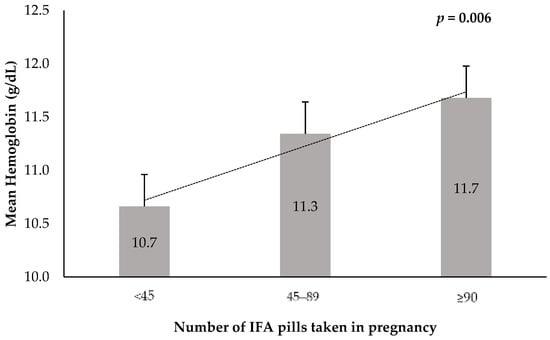 Figure 1. Maternal hemoglobin levels were positively associated with the number of IFA pills taken. Mean hemoglobin levels were 10.7 g/dL, 11.3 g/dL, and 11.7 g/dL in response to the reported number of IFA pills taken from <45, 45–89, to ≥90, respectively (
