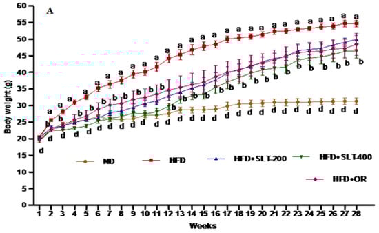 The effect of SLT on the body weight of the mice fed with HFD for 28 weeks is shown in Figure 1. The body weight of mice fed HFD increased compared to mice fed ND. A significant difference in terms of the final body weight and the decrease in body weight gain was observed in HFD + SLT 200, HFD + SLT 400, and HFD + OR group mice when compared to mice fed HFD only (Table 3). At the same time, the liver weight index of HFD + SLT mice decreased significantly (p < 0.05) compared to the mice fed HFD only. Simultaneously, this long-term preventive study showed that there was no pronounced difference in the subcutaneous fat weight among any of the experimental groups at the end of the experiment. In terms of food intake, a significant variation was observed between mice fed ND compared to those fed HFD (Table 3). Thus, no difference in food intake was observed between mice supplemented with SLT and OR in comparison to those supplemented with HFD. Body weight gain was strongly suppressed by higher dose supplementation of SLT compared to mice fed HFD only.