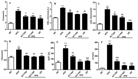 Figure 2. SLT supplementation retains serum biochemical parameters in C57BL/6 mice. (A) Total cholesterol (TC); (B) High-density lipoprotein cholesterol (HDL-C); (C) Low-density lipoprotein cholesterol (LDL-C); (D) Triglyceride (TG); (E) Aspartate aminotransferase (AST); and (F) Alanine transaminase (ALT). Values with different symbols are significantly (p < 0.05) different from each other. One-way analysis of variance (ANOVA), followed by Tukey’s test, were used to compare all pairs of columns. ** p < 0.01, and *** p < 0.001 versus ND, and # p < 0.05, ## p < 0.01, ### p < 0.001 versus HFD.