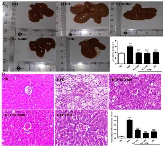 Figure 4. SLT supplementation preserved normal liver in HFD C57BL/6 mice. (A) Representative liver images and liver weight-to-BW ratio; (B) Representative images of liver tissue, Hematoxylin–Eosin (HE) staining, and quantification of fatty hepatic cells. Data are presented as mean ± SEM (n = 3–6). One-way analysis of variance (ANOVA) followed by Tukey’s test were used to compare all pairs of columns. ND: normal diet; HFD: high fat diet; SLT-200, SLT-400: animals received intragastric supplements of SLT every day at a dosage of 200 and 400 mg/kg body weight (BW), respectively; OR: intragastric administration of Orlistat at 10 mg/kg BW/day. *** p < 0.001 versus ND, and ### p < 0.001 versus HFD.