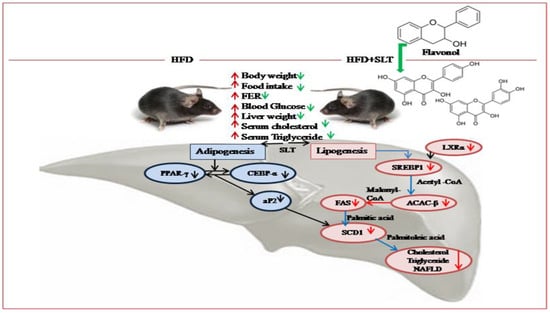 Based on our data, we propose a mechanism of SLT modulation on the lipid metabolism pathway and hepatic NAFLD in C57BL/6 mice (Figure 8). The inhibitory mechanism of SLT on lipid metabolism was achieved by repressing the fatty acid transport and storage via the suppression of signaling pathways that mediate lipogenesis along with adipogenesis in HFD-induced C57BL/6 mice. In addition, our metabolomic data suggested that flavonol derivatives rich in SLT might be functional compounds for attenuating HFD-induced NAFLD and obesity complications in C57BL/6 mice.