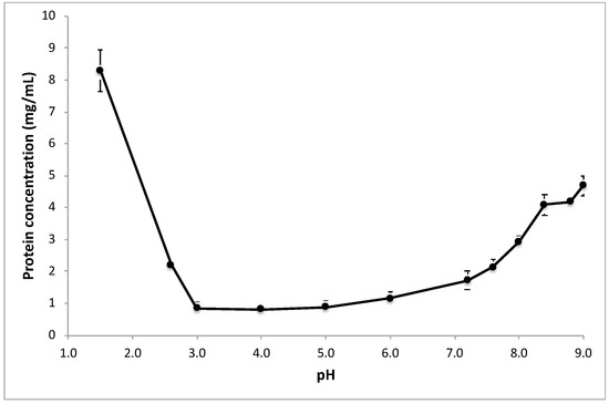 Protein release from light roasted peanut flour at various pHs. Extraction was conducted for 90 min at room temperature. Protein concentrations are shown, as measured with the BCA method (mean values of triplicate experiments; the bars show SD).