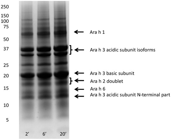 Protein profiles of light roasted peanut flour extracted with artificial saliva (pH = 7.8). Extraction time up to 20 min. Protein profiles were determined by SDS-PAGE, under reducing conditions, on 10% gels. The molecular weight marker is indicated on left in kDa, numbers at the bottom indicate extraction time (minutes). Arrows on the right margin point to major allergens.