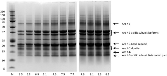 Poms et al. [28] tested the effect of pH on peanut protein extraction and the reactivity of peanut extracts in commercial enzyme-linked immune-sorbent assays (ELISAs). Interestingly, one ELISA protocol that utilized pH 6.7 as the extraction pH showed poor recovery, while the other ELISA protocols, all using extraction pHs of 7.4 or higher, showed better recoveries. It is not known whether this difference was solely due to the lower extraction pH or whether other factors played a role as well. The specificity of the used ELISA tests was not known at the time of this study, but a recent paper showed that the commercial ELISA kits used by Poms [28] essentially recognize Ara h3 [29], the protein whose extractability appeared low at pHs from 6 to 7.2 in our experiments. A more recent study by Sathe et al. [30] showed that the recovery of proteins by extraction from peanuts was about two times higher at pH 8.45 than at pH 7.2, and that in particular Ara h3 showed a different solubility. Our data are also in line with the work of Walczyk et al. [31], who showed that peanut protein solubility is low at pH 4.75 and increases at pH ≥ 8.5.