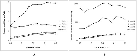 The bands of Ara h3 were more prone to this pH-dependent decrease than the bands of the other allergens, which is in line with the difference in extractability of Ara h3 between pH 7.2 and 8.45 reported by Sathe et al. [30]. Using densitometry, the amount of each allergen was determined in extracts prepared at the different pH conditions. Figure 5 shows that, at pH 6.5, the concentrations of Ara h1, Ara h2, Ara h3, and Ara h6 were 0.24, 1.52, 1.58, and 0.40 mg/mL, respectively, and these concentrations increased with increasing extraction pH, in particular for Ara h3, but also for Ara h1 and Ara h6. The recoveries for Ara h1 and Ara h3 were low at pH 6.5, i.e., 5% and 6% of the theoretical maximal values, respectively (Figure 5B). These recovery percentages increased to 18 and 15% for Ara h1 and Ara h3, respectively, when the extraction pH was elevated to 8.5. The recovery of Ara h2 was around 100% at all saliva pHs, and the recovery of Ara h 6 increased from about 35% to 65% with increases in the pH.