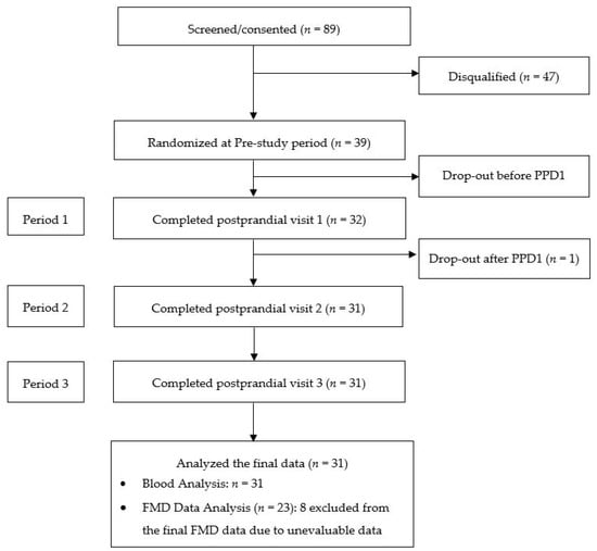 Consolidated Standards of Reporting Trials (CONSORT) flow diagram of the study. PPD, Postprandial study day; FMD, Flow mediated vasodilation.
