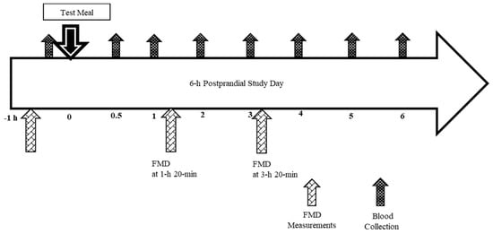 6-h postprandial study day schema. FMD indicates flow mediated vasodilation.