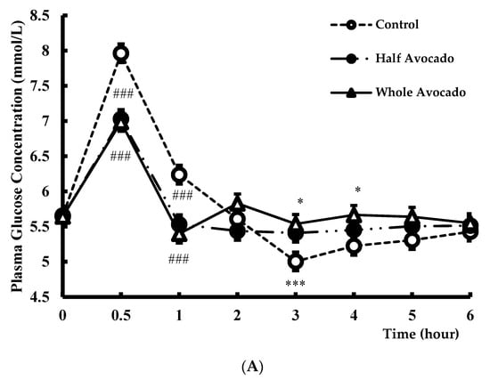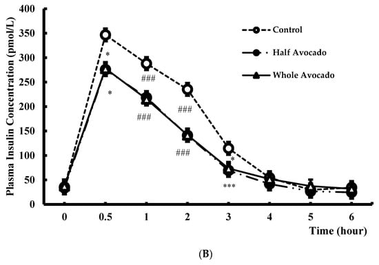 Blood was collected from indwelling catheters at protocol-specified time points into Ethylenediaminetetraacetic acid (EDTA) tubes and centrifuged at 12,857× g at 4 °C for 15 min to obtain plasma. Aliquots of plasma were stored immediately at −80 °C for subsequent analysis. Plasma glucose concentrations were measured using standardized enzyme-based assay kits (Cat # TR3823 and GL3815, respectively, Randox, Antrim, UK) on the Randox Daytona Auto Clinical Analyzer (Randox, Antrim, UK). Plasma insulin was assessed using an immunoturbidimetry assay (Cat# KAI071, Kamiya Biomedicals, Tukwila, WA, USA). Plasma oxidized low density lipoprotein (Ox-LDL) was measured using ELISA assay kits (Cat# 10-1143-01, Mercodia Inc., Winston Salem, NC, USA). Interleukin (IL)-6 and Monocyte chemoattractant protein (MCP)-1 in plasma samples were measured using high sensitive ELISA assay methods (Cat# HS 600B and DCP00 respectively. R&D Systems, Minneapolis, MN, USA). All assay protocols were performed according to the manufacturers’ instructions and appropriate quality controls were used as applicable. Intra and inter assay % coefficient of variation (CV) was below 10% in all the assays tested. Lipoprotein particles were analyzed for two meals (Control and Whole avocado meals) using Nuclear magnetic resonance (NMR) spectra of frozen plasma specimens by LipoScience (Raleigh, NC, USA).
