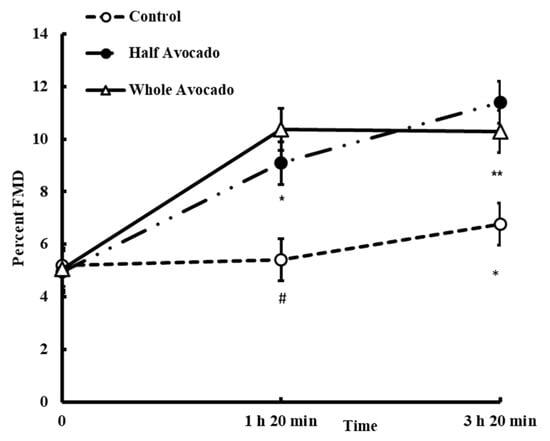 Changes in FMD were not different between meals at baseline (p > 0.05); however significant effects of meal (p = 0.0002), time (p < 0.0001) and meal by time interaction were evident (p = 0.002, Figure 4). In general, after eating the Control meal, FMD increased ~0.2% and ~1.6% at 1 h 20 min and 3 h 20 min in later, respectively, whereas when avocado was incorporated in the meals, percent FMD doubled from ~5% (at time 0 min) to ~10% at 20 min past 1 and 3 h. Both the Half-A and Whole-A meals significantly increased FMD compared to the Control meal at 1 h 20 min (p = 0.0346, p = 0.0007, respectively) and at 3 h 20 min (p = 0.0013, p = 0.045, respectively).