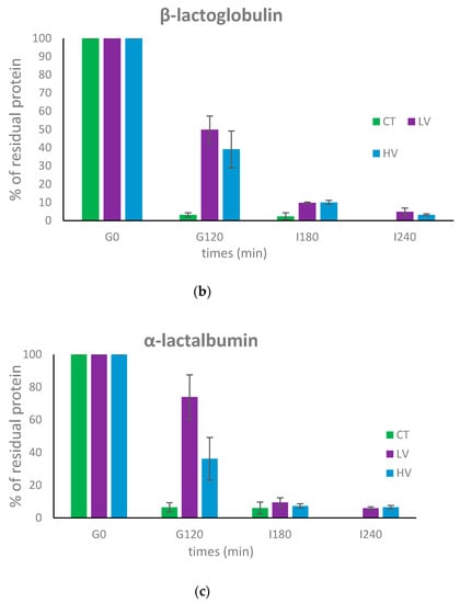 - Mandalari, G.; Adel-Patient, K.; Barkholt, V.; Baro, C.; Bennett, L.; Bublin, M.; Gaier, S.; Graser, G.; Ladics, G.; Mierzejewska, D.; et al. In vitro digestibility of beta-casein and beta-lactoglobulin under simulated human gastric and duodenal conditions: A multi-laboratory evaluation. Regul. Toxicol. Pharmacol. 2009, 55, 372–381. [Google Scholar] [CrossRef] [PubMed]