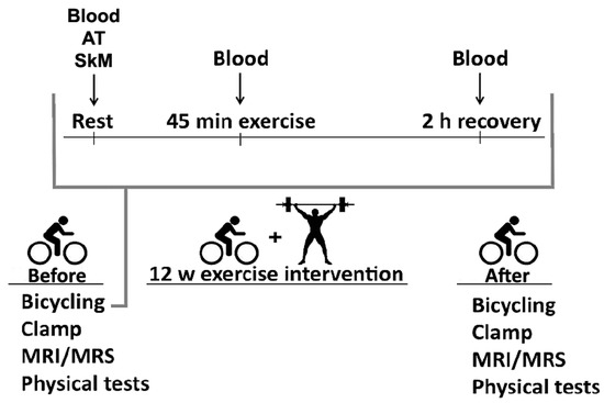 The participants refrained from physical exercise and alcohol for two days before any testing. Thus, the training sessions, maximum oxygen uptake (VO2max) tests, clamp tests, and biopsy samplings did not interfere with each other, and were performed under similar conditions at different days before as well as after 12 w exercise intervention [27].