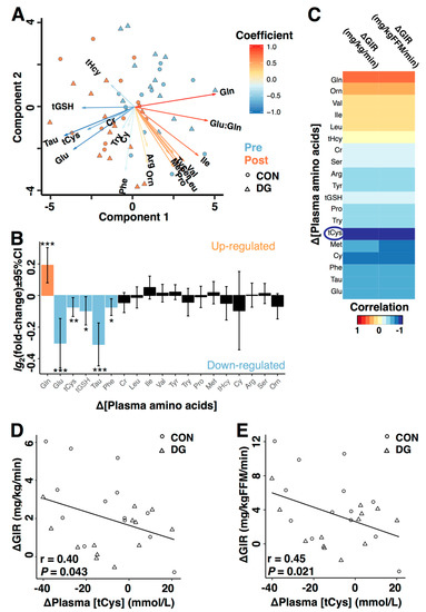 Plasma metabolites, long-term exercise, and insulin sensitivity. (A) Participants before (blue) and after (orange) 12 w exercise intervention clustered to the right and left along the x-axis, respectively. The variables most parallel to the direction of separation along the x-axis were glutamine, glutamate, glutathione, taurine, and total cysteine, indicating that changes in these variables were most strongly associated to long-term physical exercise. No apparent differences were observed between the two groups. Multilevel partial least squares discriminant analysis was performed (see Methods for details). (B) Using repeated measures linear mixed models, we quantified the relative change in plasma metabolite concentrations in response to 12 w exercise intervention. The plot shows fold changes after intervention as compared to baseline (zero) for each metabolite. Log2-transformation is necessary for symmetrical representation, meaning that the magnitude of up/down-regulation is symmetrically presented. Positive responses are >0 and negative responses are <0. * p < 0.05, ** p < 0.01, *** p < 0.001 vs. baseline. p-values were corrected for multiple testing (see methods). (C) Correlations between change in plasma metabolite concentrations and change in glucose infusion rate (GIR). (D) Correlations between change in plasma concentrations of total cysteine and GIR normalized to body weight and (E) fat free mass (FFM) quantified from MRI. Coefficient = beta-coefficients from partial least squares discriminant analysis on Z-scores where blue arrows indicate higher value pre-intervention, whereas red arrows indicate higher value post intervention. CI = confidence interval. Gln = Glutamine, Glu = glutamate, tCys = total cysteine, tGSH = total glutathione, Tau = taurine, Ser = serine, Cr = creatinine, tHcy = total homocysteine, Met = methionine, Cy = cystathionine, Arg = arginine, Val = valine, Pro = proline, Orn = ornithine, Leu = leucine, Ile = iso-leucine, Tyr = tyrosine, Phe = phenylalanine, Try = tryptophan, MRI = magnetic resonance imaging, DG = dysglycemic, and CON = control men.