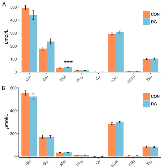 Group differences in plasma metabolite concentrations. (A) Plasma concentrations of sulphur-containing amino acids in dys- vs. normoglycemic men at baseline, (B) and after 12 w of intervention. Gln = glutamine. Glu = glutamate. Met = methionine. tHcy = total homocysteine. Cy = cystathionine. tCys = total cysteine. tGSH = total glutathione. Tau = taurine. DG = dysglycemia. CON = control. Data represent means ± sem. *** p < 0.001 using an unpaired t-test. p-values were corrected for multiple testing (see methods).