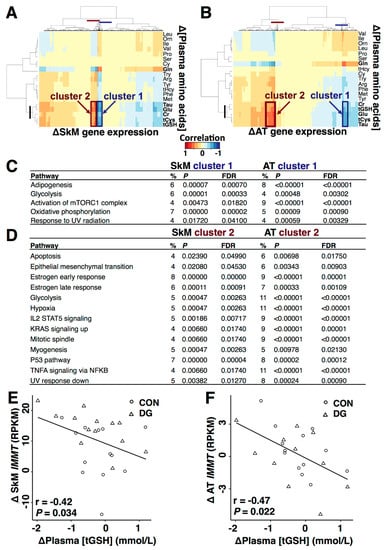 Plasma metabolite concentrations, skeletal muscle, and adipose tissue gene expression. (A) Change (after minus before) in plasma metabolite concentrations and correlations to change in skeletal muscle and (B) adipose tissue gene expression after 12 w exercise intervention. Partial least squares analyses were performed followed by Euclidian distance hierarchical clustering (see Methods for details). Red = positive correlations and blue = negative correlations, as indicated by the colour key below panels A and B. Gene clusters discovered in both skeletal muscle and adipose tissue is marked by squares and numbered in both panels (point out by arrows). Lines on the row and column dendrograms mark the cut-levels defining the clusters. (C,D) Gene cluster members overlapped similar metabolic pathways in both tissues. (E) Change in plasma concentration of total glutathione correlated negatively to change in mRNA levels of mitofilin (IMMT) in skeletal muscle and (F) adipose tissue. The x and y axes depict change (Δ = after−before) in plasma total glutathione concentration and mitofilin expression. % = pathway enrichment. FDR = false discovery rate, p-value after correction for multiple testing (see methods). SkM = skeletal muscle, AT = adipose tissue, Gln = Glutamine, Glu = glutamate, tCys = total cysteine, tGSH = total glutathione, Tau = taurine, Ser = serine, Cr = creatinine, tHcy = total homocysteine, Met = methionine, Cy = cystathionine, Arg = arginine, Val = valine, Pro = proline, Orn = ornithine, Leu = leucine, Ile = iso-leucine, Ty = tyrosine, Phe = phenylalanine, Try = tryptophan, RPKM = Reads Per Kilobase Million, and IMMT = inner membrane mitochondrial protein (mitofilin), mTORC = mammalian target of rapamycin complex 1, UV = ultraviolet, IL = interleukin, STAT = signal transducers and activators of transcription, KRAS = kirsten rat sarcoma 2 viral oncogene homolog, p53 = tumour protein 53, TNF = tumour necrosis factor, NFKB = nuclear factor kappa B.