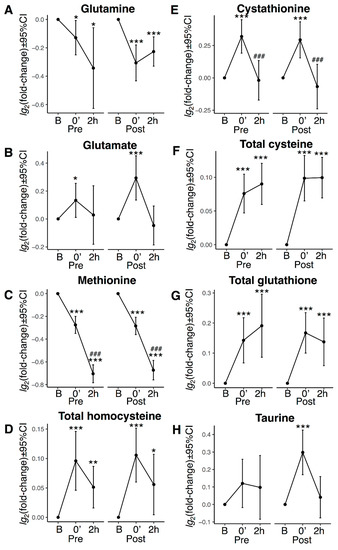 Plasma sulphur-containing amino acids, related metabolites, and acute exercise. Forty-five min bicycling and responses in plasma concentrations of (A) glutamine, (B) glutamate, (C) methionine, (D) total homocysteine, (E) cystathionine, (F) total cysteine, (G) total glutathione, and (H) taurine. B = baseline. 0′ = directly after bicycling. 2h = 2 hours recovery from bicycling. CI = confidence interval. * p < 0.05, ** p < 0.01, *** p < 0.001 vs. baseline, ### p < 0.001 vs. 0′. p-values were corrected for multiple testing (see methods).
