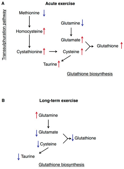 Summary of findings. (A) Acute exercise and observed changes in plasma metabolites concentrations associated to transsulphuration and glutathione production. (B) Long-term exercise and observed changes in plasma metabolites concentrations associated to glutathione production. Red arrows indicate an increase, and blue arrows indicate a decrease in plasma concentration.
