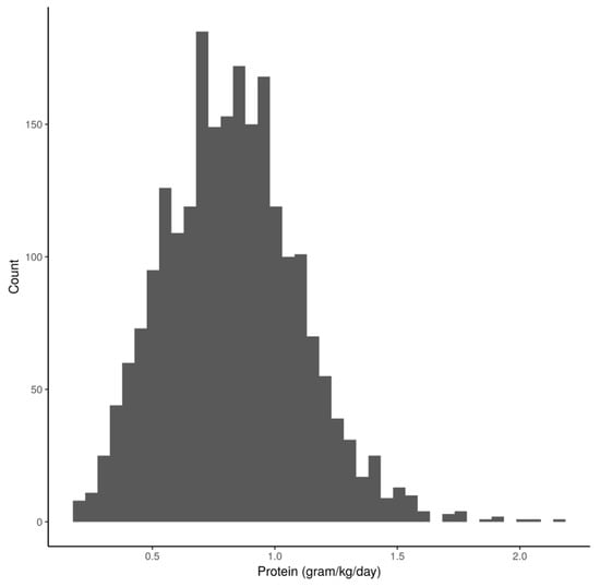 A total of 2253 patients were included in the study. Mean protein delivery for the overall cohort was 0.64 (±0.33) g/kg for the first 3 days, and 0.83 (±0.28) g/kg throughout the hospitalization period. A histogram of administered protein values is presented in Figure 1.