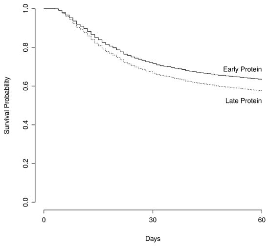 Survival. This figure shows adjusted survival estimates of the survival curves among patients receiving early or late protein. The Hazard Ratio for death was calculated at 0.83 (95%, CI 0.71–0.97) with a p value of 0.01 using a multivariable Cox regression analysis that controlled for age, sex, weight, parenteral nutrition, mean delivered calories, mean daily protein received after the first 3 days, administration of vasopressors, SOFA score, and total hospital stay.