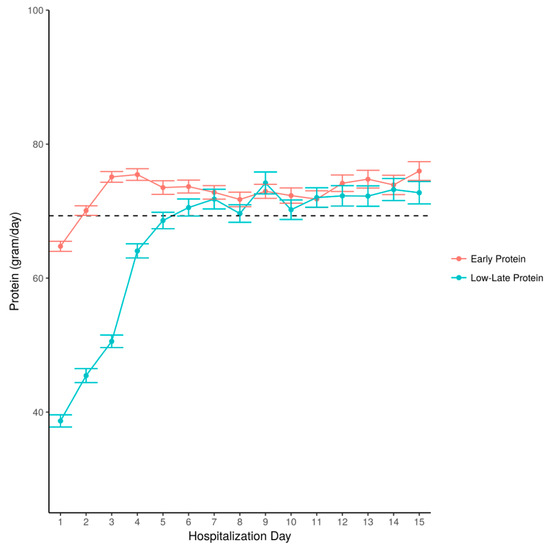 Amount of protein administered by hospitalization day—a comparison between the early protein and the late-low groups. Legend: The amount of daily protein, presented as grams per day, is shown according to hospitalization day. Stratification according to patient groups: those who received early protein and those who received late-low protein. Dotted line—mean amount for all patients throughout hospitalization.