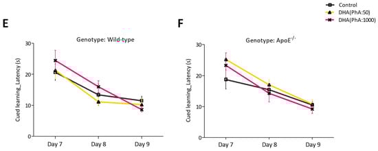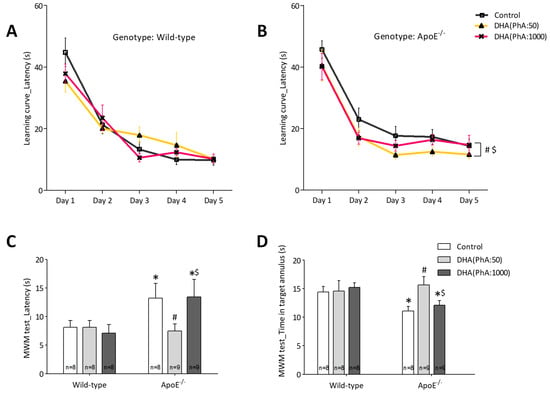 Effects of DHA (PhA:50) and DHA (PhA:1000) on the curve learning (A,B), spatial memory (C,D), and visual cue localization (E,F) in the Morris Water Maze (MWM) test in ApoE−/− and wild-type mice. Data shown as mean ± SEM. * p < 0.05 compared to control wild-type mice; # p < 0.05 compared to control ApoE−/− mice; $ p < 0.05 compared between DHA (PhA:50) and DHA (PhA:1000) in ApoE−/− mice. (n = 8 or 9).