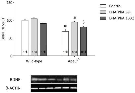 Effects of DHA (PhA:50) and DHA (PhA:1000) on relative protein expression brain derived neurotrophic factor (BDNF) in hippocampus of ApoE−/− and wild-type mice. Data show mean ± SEM. * p < 0.05 compared to control wild-type mice; # p < 0.05 compared to control ApoE−/− mice; $ p < 0.05 compared between DHA (PhA:50) and DHA (PhA:1000) in ApoE−/− mice. (n = 8).