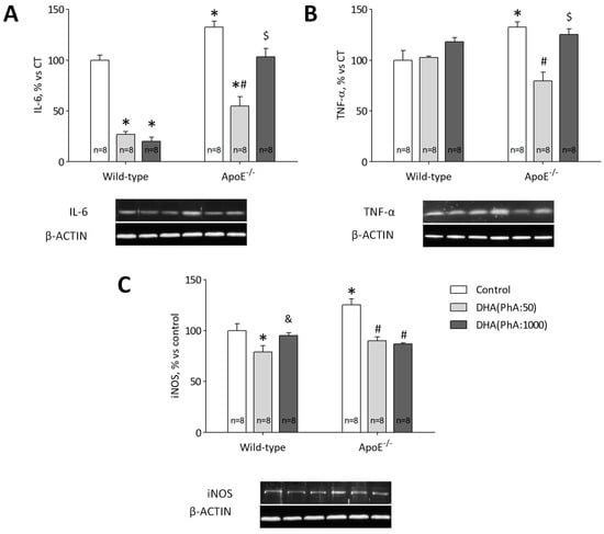 Effects of DHA (PhA:50) and DHA (PhA:1000) on relative protein expression of (A) interleukin-6 (IL-6), (B) tumor necrosis factor alpha (TNF-α) and (C) inducible nitric oxide synthase (iNOS) in hippocampus of ApoE−/− and wild-type mice. Data shown as mean ± SEM. * p < 0.05 compared to control wild-type mice; # p < 0.05 compared to control ApoE−/− mice; & p < 0.05 compared between DHA (PhA:50) and DHA (PhA:1000) in wild-type mice; $ p < 0.05 compared between DHA (PhA:50) and DHA (PhA:1000) in ApoE−/− mice. (n = 8).