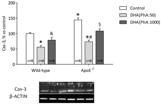 Effects of DHA (PhA:50) and DHA (PhA:1000) on relative protein expression of caspase-3 (cas-3) in hippocampus of ApoE−/− and wild-type mice. Data shown as mean ± SEM. * p < 0.05 compared to control wild-type mice; # p < 0.05 compared to control ApoE−/− mice; & p < 0.05 compared between DHA (PhA:50) and DHA (PhA:1000) in wild-type mice; $ p < 0.05 compared between DHA (PhA:50) and DHA (PhA:1000) in ApoE−/− mice. (n = 8).