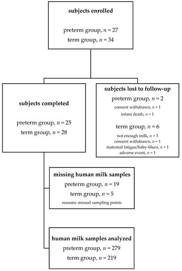 Eligibility criteria for this study included women older than 18 years of age giving (1) preterm birth (between gestational ages 28 0/7 and 32 6/7 weeks) or (2) term birth (>37 0/7 and not above 41 6/7 weeks) with mothers’ intention to exclusively or partially breastfeed at least until 4 month post-partum. Exclusion criteria included gestational and pre-gestational diabetes (type I or II), alcohol or illicit drug consumption and insufficient skills to understand study questionnaire. Availability of refrigerator/freezer at home for storage of collected human milk samples was required.