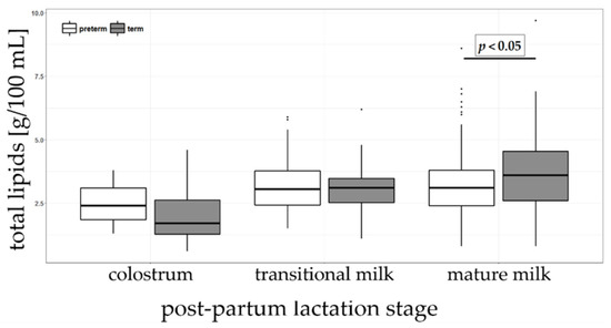 Total lipids was measured by MIRIS® HMA as previously described by Giuffrida et al. [23] and results are listed in Table 2. Total lipids content increased from colostrum (2.4 and 1.7 g/100 mL preterm and term HM, respectively) to mature milk (3.1 and 3.6 g/100 mL in preterm and term HM, respectively). Significant differences in total lipid content were observed between preterm and term groups but only in mature milk (Figure 2).