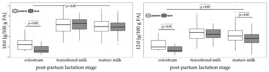 Capric (10:0, left panel) and lauric (12:0, right panel) acids in colostrum, transitional and mature milk in preterm and term groups. The results are expressed as percentages (g/100 g sum of FA).