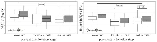 Palmitic (16:0, left panel) and oleic (18:1 n-9, right panel) acids in colostrum, transitional and mature milk in preterm and term. The results are expressed as percentages (g/100 g sum of FA).