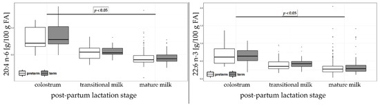 The concentration of DHA decreased over stages of lactation for both groups, preterm and term HM. This trend has been described by numerous studies reported in the literature [19,31,35,37,38,39]. However, consistency is not observed when comparing the concentrations of DHA in milk within term and preterm groups. In our study we did not observe significant differences, yet it has been reported by Kovács et al. [36] that there is significantly higher DHA in preterm milk than in term milk for first 21 day post-partum. On the other hand Rueda et al. [39], reported to have higher DHA in term milk over preterm milk for first week post-partum. Since DHA content of mothers milk is sensitive to maternal intake of food rich in sources of DHA [41], it may explain the differences observed in different studies. It also may be prudent to note that preterm offspring may benefit from fortifying mothers’ own milk in populations where dietary/supplementary intake of sources of DHA may be lower than ideal.