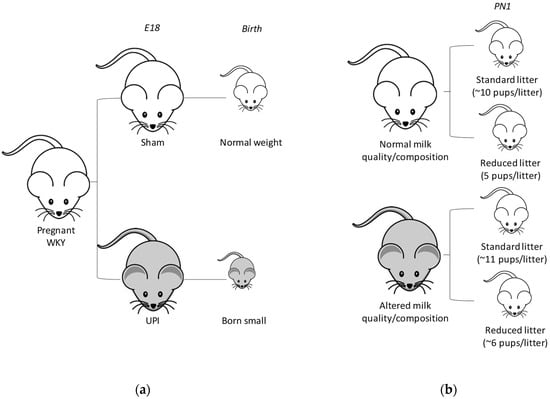 All experiments were approved by The University of Melbourne’s animal experimentation ethics sub-committee (AEC: 02081) following the National Health and Medical Research Councils (NHMRC) Australian code for the care and use of animals for scientific purposes. Female WKY rats (9 to 13 weeks of age) were obtained from the Animal Resources Centre (Canning Vale, WA, Australia) and provided with a 12-h light/dark cycle at 19–22 °C with ad libitum access to food and water. To generate rats with ‘normal’ and ‘altered’ milk quality/composition, rats were mated and surgery performed on day 18 of gestation (term = 22 days) as described previously []. Briefly, F0 pregnant rats were randomly allocated to a sham (Normal milk quality/composition; Control; n = 7–8 per group) or uteroplacental insufficiency (Altered milk quality/composition; Restricted; n = 8 per group) group, that experience premature lactogenesis [], and were anaesthetized with 4% isoflurane and 650 mL/min oxygen flow (reduced to 3.2% isoflurane and 250 mL/min oxygen flow when suturing to aid in the animals recovery) to reduce the duration of anesthetic exposure and aid in recovery []. Rats were then allowed to deliver naturally (Figure 1a). Pups from the sham (Control) operated dams were cross-fostered 1 day after birth (PN1) randomly onto separate dams (Control or Restricted) where the litter size was unaltered from the surrogate (Standard) or reduced to 5 pups (Reduced) giving rise to four experimental groups (Figure 1b); Standard litter size suckled by Normal milk quality/composition dams (mean litter size 10.38; range 9–12 pups), Reduced litter size suckled by Normal milk quality/composition (mean litter size 5.00; range 5 pups), Standard litter size suckled by Altered milk quality/composition dams (mean litter size 11.50; range 7–15 pups) and Reduced litter size suckled by Altered milk quality/composition (mean litter size 6.00; range 3–9 pups) with n = 15–18 dams per group [,,,,]. Birth weight (3.5 ± 0.4 g vs. 4.0 ± 0.04 g for Restricted and Control dams, respectively) and litter size (8.5 ± 0.4 pups vs. 11.1 ± 0.4 pups for Restricted and Control dams, respectively) of pups born to ligation surgery (Restricted; Altered milk quality/composition) dams was reduced compared to sham-operated (Control; Normal milk quality/composition) dams.