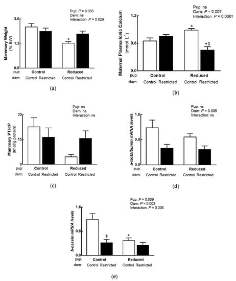 Effect reducing litter size has on maternal and mammary outcomes (n = 5–9 per group). (a) Mammary weight, (b) maternal ionic calcium concentrations and (c) mammary PTHrP protein concentration, (d) a-lactalbumin and (e) b-casein mRNA expression. Data are analysed with a two-way ANOVA reporting differences between Pup (Standard and Reduced litters) and Dam (Normal and Altered milk quality/composition) groups, with a Tukey’s post-hoc test used to identify where interactions lie. Data presented as the mean ± SEM, where ns is not significant. Significant differences between Standard and Reduced litter pups are indicated by an asterisk (* p < 0.05) and differences between sham operated (Control; Normal milk quality/composition) and uteroplacental insufficiency surgery (Restricted; altered milk quality/composition) dams are indicated with a double dagger (‡ p < 0.05). Normal milk quality/composition dams denoted by white open bars and Altered milk quality/composition dams denoted by black closed bars.