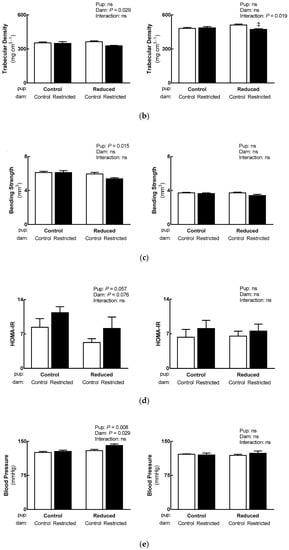 Providing offspring with adequate and appropriate nutrition during lactation is essential for long-term health, with both over- and undernutrition increasing disease susceptibility [,,]. We have previously demonstrated that both the dam and suckling pup can influence maternal milk composition, and that these effects generally represent an attempt to improve pup growth and development []. The current study has demonstrated that reducing litter size at birth, regardless of whether the dam has normal or altered milk quality/composition impairs pup calcium homeostasis, which may reduce bone bending strength in male offspring. Additionally, these adult Reduced litter males appear to have increased cardiovascular disease risk and decreased diabetes risk. Furthermore, altered milk quality/composition (induced by uteroplacental insufficiency surgery) similarly programs poor bone health, high blood pressure and impairs glucose tolerance/insulin sensitivity. These finding are likely due to differential influences of the predetermined litter size at birth [] and effects on milk quality. This highlights that caution needs to be taken when interpreting animal studies that focus on early life nutrition, as the experimental approach may independently modulate milk nutrition and quality.