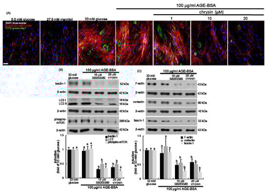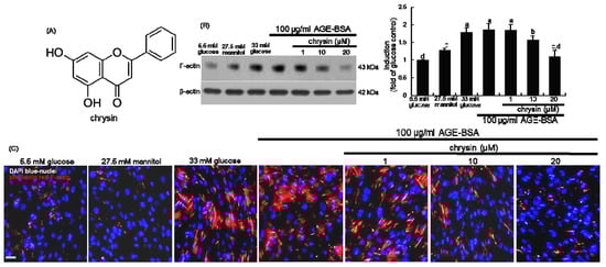 Chemical structure of chrysin (A), and inhibition of F-actin induction by chrysin in advanced glycation end products (AGE)-bovine serum albumin (BSA)-exposed human renal mesangial cells (HRMC, B and C). HRMC were challenged with 5.5 mM glucose, 5.5 mM glucose plus 27.5 mM mannitol as osmotic controls or with 33 mM glucose or 100 μg/mL AGE-BSA in the absence and presence of 1–20 μM chrysin. The F-actin induction was measured by Western blot analysis using cell lysates with a primary antibody of F-actin (B). β-Actin protein was used as an internal control. Representative blots shown are typical of three independent experiments. The bar graphs (mean ± SEM) in the right panel represent quantitative results obtained from a densitometer. Values not sharing a letter are different at p < 0.05. Red-rhodamine phalloidin staining for F-actin formation was conducted in AGE-BSA-exposed HRMC (C). Nuclear counter-staining was done by using blue 4’,6-diamidino-2-phenylindole. Scale bar = 50 µm. Each photograph is representative of at least four animals. Magnification: 200-fold.