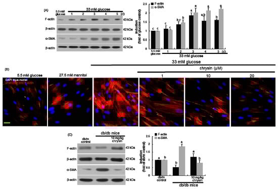Temporal responses of protein induction of F-actin and α-SMA to glucose (A), inhibition of F-actin formation by chrysin in glucose-exposed human renal mesangial cells (HRMC, B) and tissue levels of F-actin and α-SMA in chrysin-treated diabetic kidneys (C). HRMC were challenged with 5.5 mM glucose, 5.5 mM glucose plus 27.5 mM mannitol as osmotic controls or with 33 mM glucose in the absence and presence of 1–20 μM chrysin. Diabetic mice were orally administrated with 10 mg/kg chrysin for 10 weeks. The induction of F-actin and α-SMA was measured by Western blot analysis using cell lysates and renal tissue extracts with a primary antibody of F-actin or α-SMA (A,C). β-Actin protein was used as an internal control. Representative blots shown are typical of three independent experiments. The bar graphs (mean ± SEM) in the right panel represent quantitative results obtained from a densitometer. Values not sharing a letter are different at p < 0.05. Red-rhodamine phalloidin staining for F-actin formation was conducted in high glucose-exposed HRMC (B). Nuclear counter-staining was done by using blue 4’,6-diamidino-2-phenylindole. Scale bar = 50 µm. Each photograph is representative of at least four animals. Magnification: 400-fold.