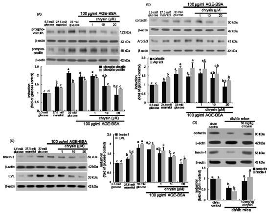 Western blot data showing inhibitory effects of chrysin on AGE-induced cellular induction of phospho-vinculin and phospho-paxillin (A), cortactin and Arp2/3 (B) and fascin-1 and EVL (C) in human renal mesangial cells (HRMC). HRMC were challenged for 3 days with 5.5 mM glucose, 5.5 mM glucose plus 27.5 mM mannitol as osmotic controls, 33 mM glucose or 100 μg/mL AGE-BSA in the absence and presence of 1–20 μM chrysin. db/db mice were orally administrated with 10 mg/kg chrysin for 10 weeks (D). Cellular induction of phospho-vinculin, phospho-paxillin, cortactin, Arp2/3, fascin-1 and Ena/VASP (EVL) were measured by Western blot analysis with each of their primary antibodies. The renal tissue levels of cortactin and fascin-1 were also measured (D). The bar graphs (mean ± SEM, n = 3) in the bottom or right panels represent quantitative results obtained from a densitometer. β-Actin protein was used as an internal control. Values not sharing a letter are different at p < 0.05.