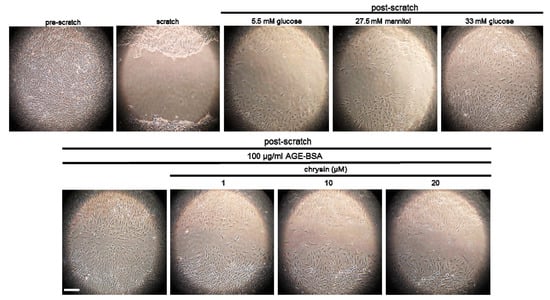 In vitro scratch wound healing assay showing inhibition of migration of glucose- and AGE-exposed human renal mesangial cells (HRMC) by chrysin. HRMC were challenged for 3 days with 5.5 mM glucose, 5.5 mM glucose plus 27.5 mM mannitol as osmotic controls, 33 mM glucose, or 100 μg/mL AGE-BSA in the absence and presence of 1–20 μM chrysin. In vitro scratch wound healing assay was performed (see the Materials and Methods). Scale bar = 200 µm. Each photograph is representative of at least four animals. Magnification: 200-fold.